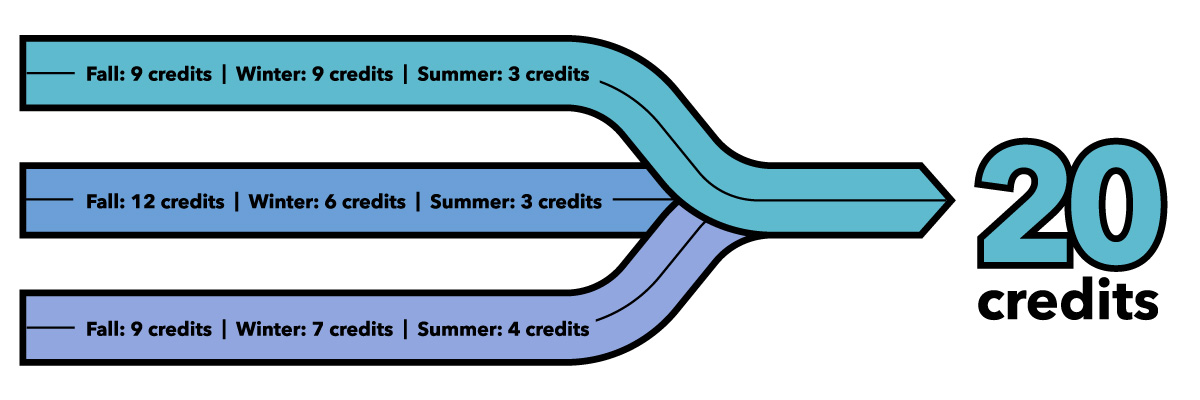 - Fall: 15 credits; Winter: 12 credits; Summer: 3 credits